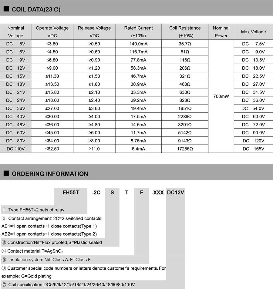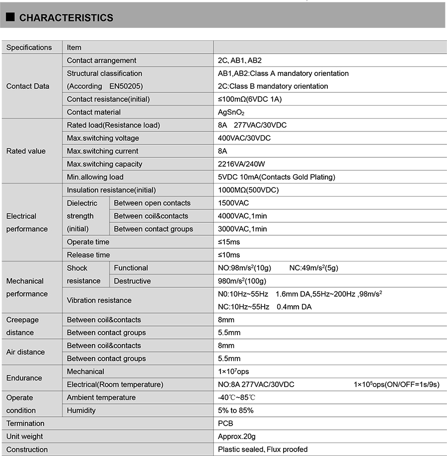● Strong insulation ability:Surge voltage (Between coil&contacts) :10KV Surge voltage(Between contact groups) (Waveform 1.2/50μs):6kV