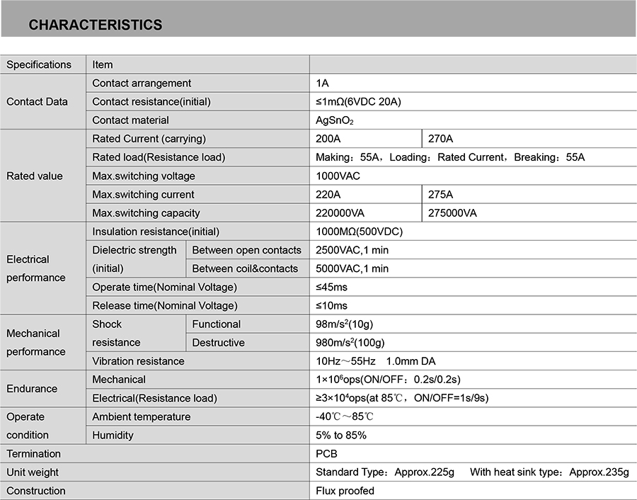 ● 200A/270A switching capability