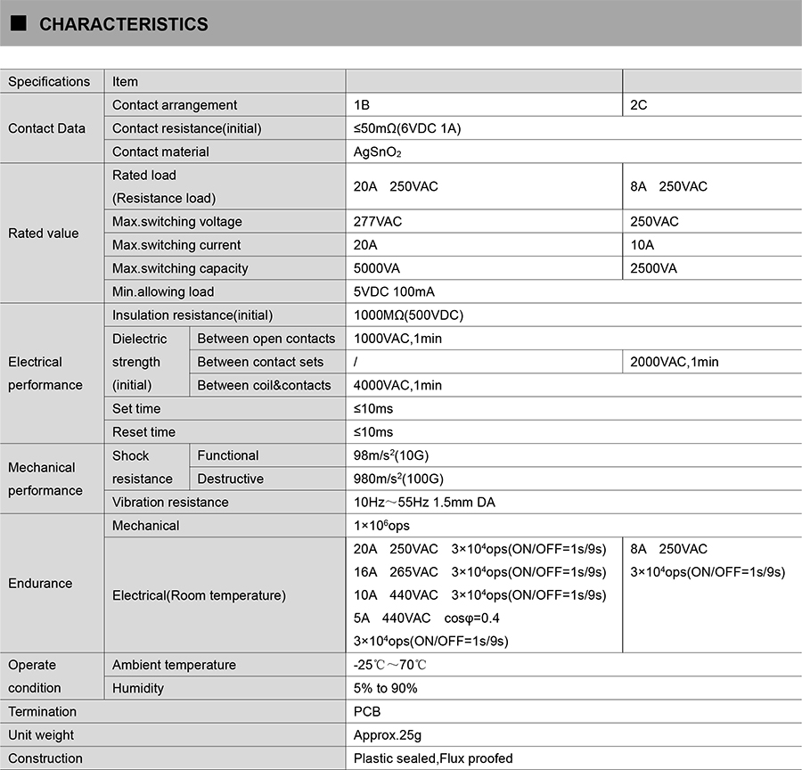 ● 1 sets of 20A switching capability,2 sets of 10A switching capability