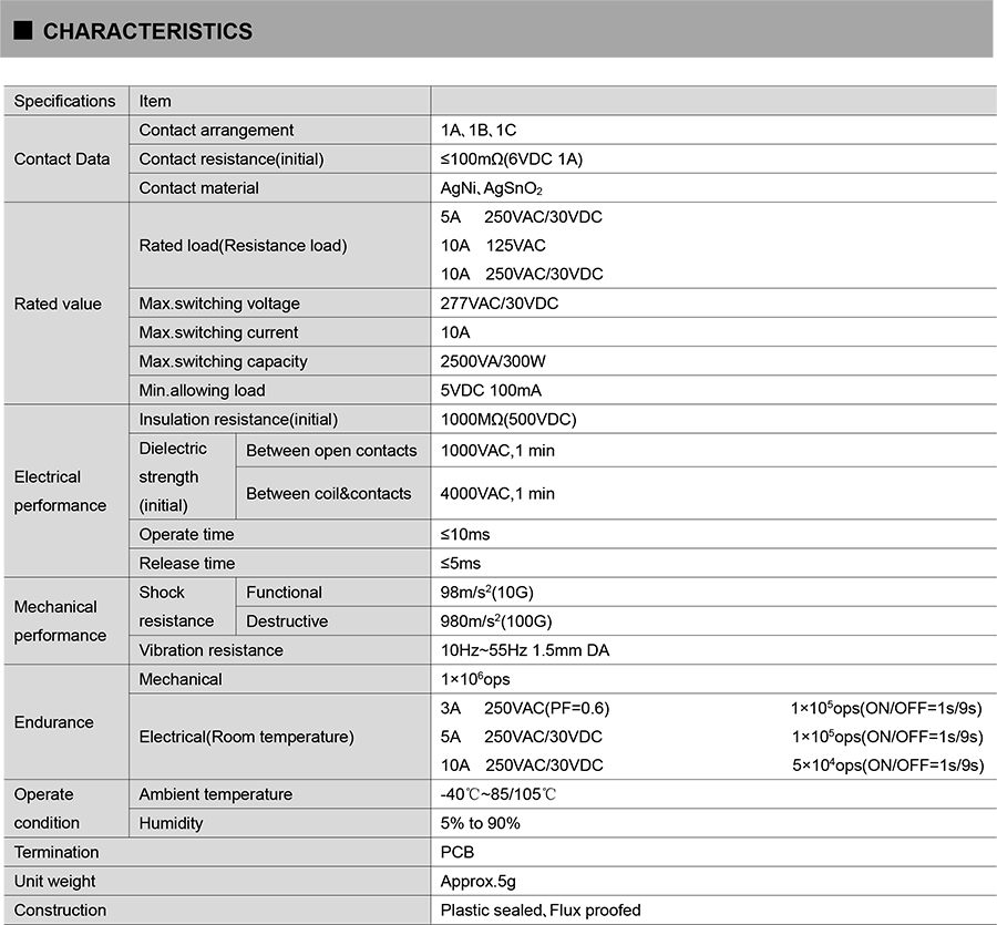 ● Breakdown voltage (between coil and contacts):5KV