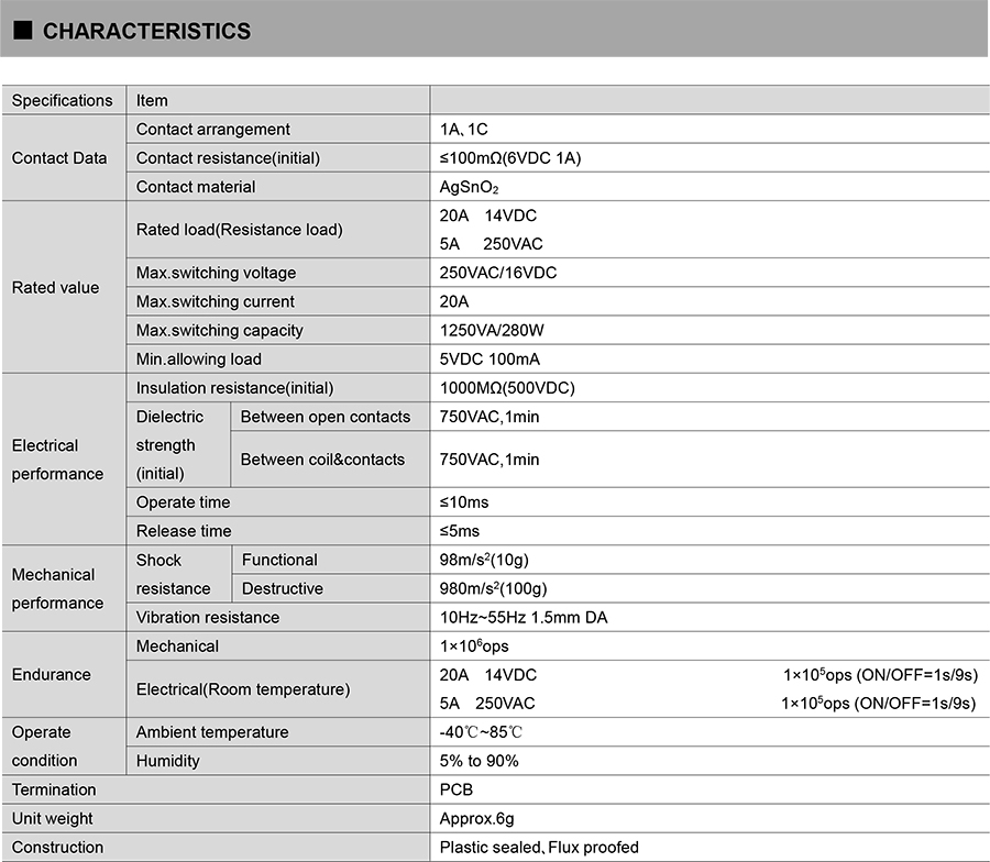 ● 20A 14VDC switching capability