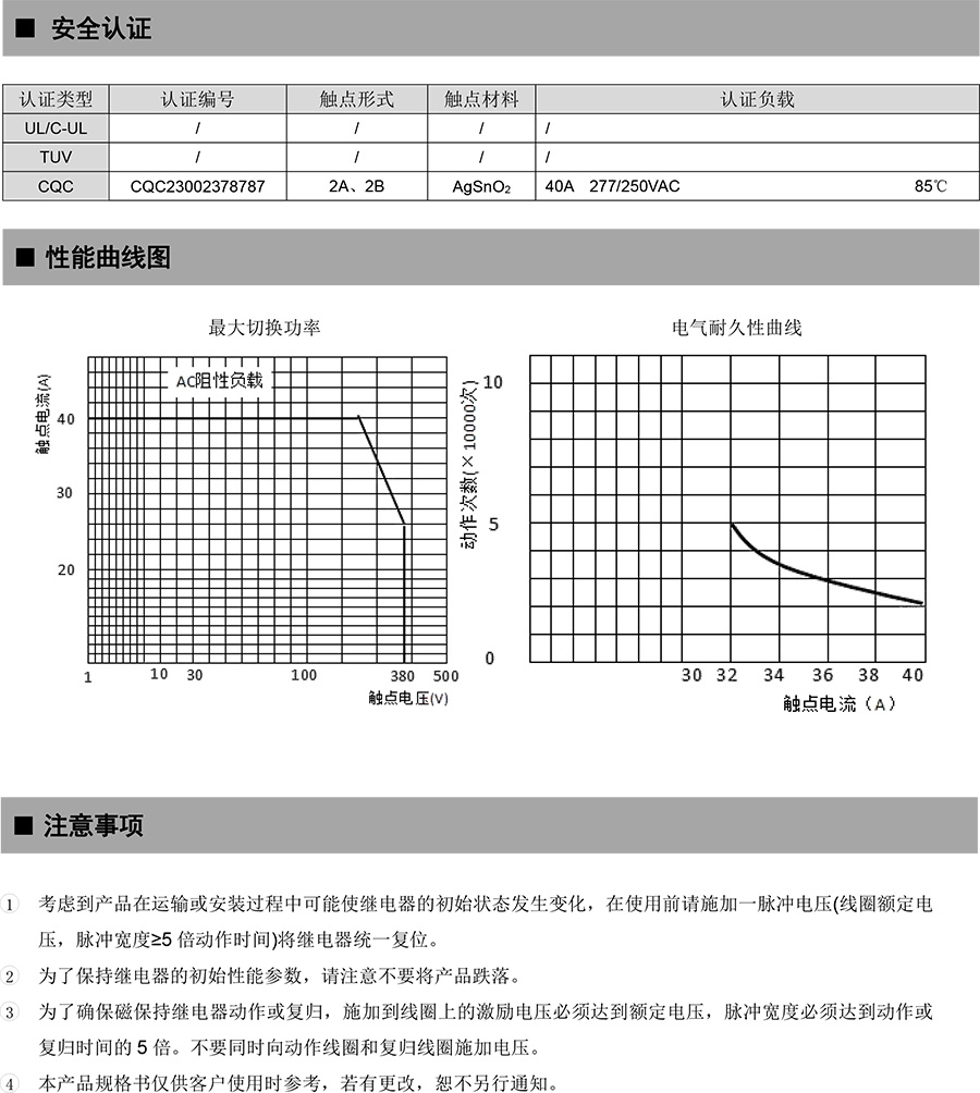 ●觸點能承受1020A 10ms 短路沖擊電流